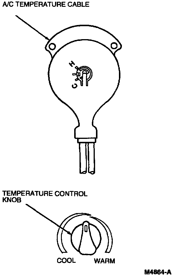 1. Position A/C temperature cable to the midpoint of its adjustment, directly between H and C. Position the temperature control knob to the midpoint of its adjustment and connect A/C temperature cable to the geared arm on blower motor wheel. Rotate temperature control knob from maximum cool to maximum warm to verify proper range of rotation.