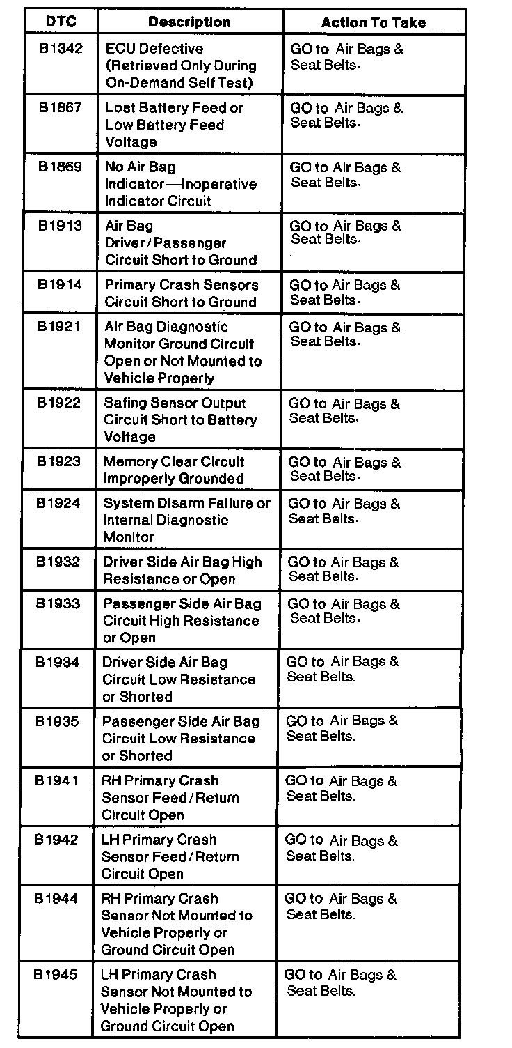 Air Bag Diagnostic Monitor DTC Index