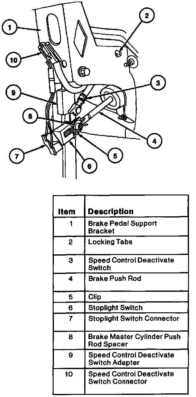 NOTE: Since the switch side plate nearest the brake pedal is slotted, it is not necessary to remove brake master cylinder push rod black bushing or white speed control deactivate switch bracket nearest the pedal arm from brake pedal pin.