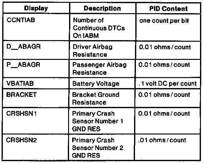 Air Bag Diagnostic Monitor Parameter Identification (PID) Index