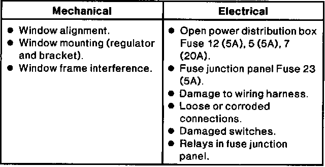 2. Inspect the components of the power window system to determine if any of the following mechanical or electrical concerns apply.