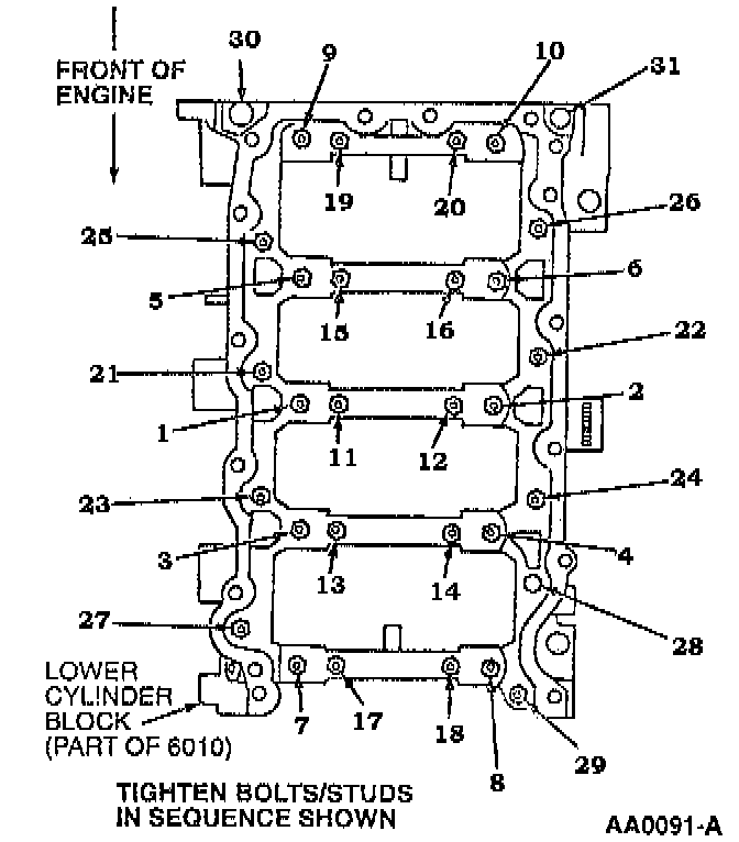 Tighten lower cylinder block to upper cylinder block retaining bolts in sequence, as follows: