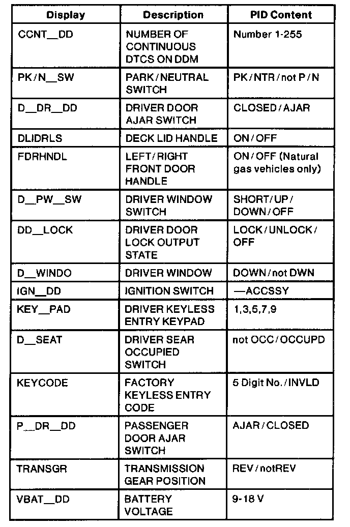 Driver Door Module (DDM) Parameter Identification (PID) Index