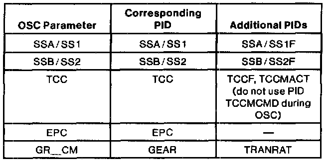 To confirm that the OSC value was sent by the NGS and the EEG has accepted the OSC substitution, a corresponding PID for each OSC parameter must be monitored. Additional PIDs should be monitored to help the technician adequately diagnose the transmission.The following is a list of OSC parameters and their corresponding PID: