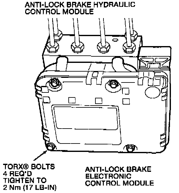 1. Position anti-lock brake control module on brake pressure control valve block. Connect 2-pin connector.