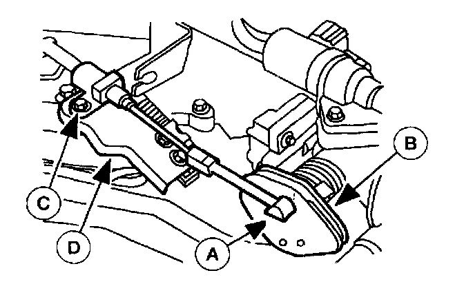 2. Disconnect the (A) speed control actuator cable from the (B) throttle control lever and remove the (C) bolt from the (D) bracket.