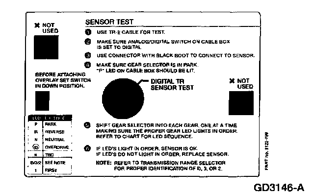 Installing the Transmission Tester and TR Testing Cable "E" 418-107 (007-00111) or equivalent with Digital TR Sensor Overlay 007-00131 or equivalent at the transmission connector allows separation of the digital TR sensor electronics from the vehicle electronics.