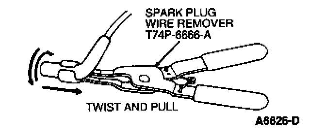 1. When removing ignition wires from spark plugs, use Spark Plug Wire Remover 303-106 (T74P-6666-A). Grasp and twist the ignition wire spark plug boot back and forth on the spark plug insulator to free the boot.