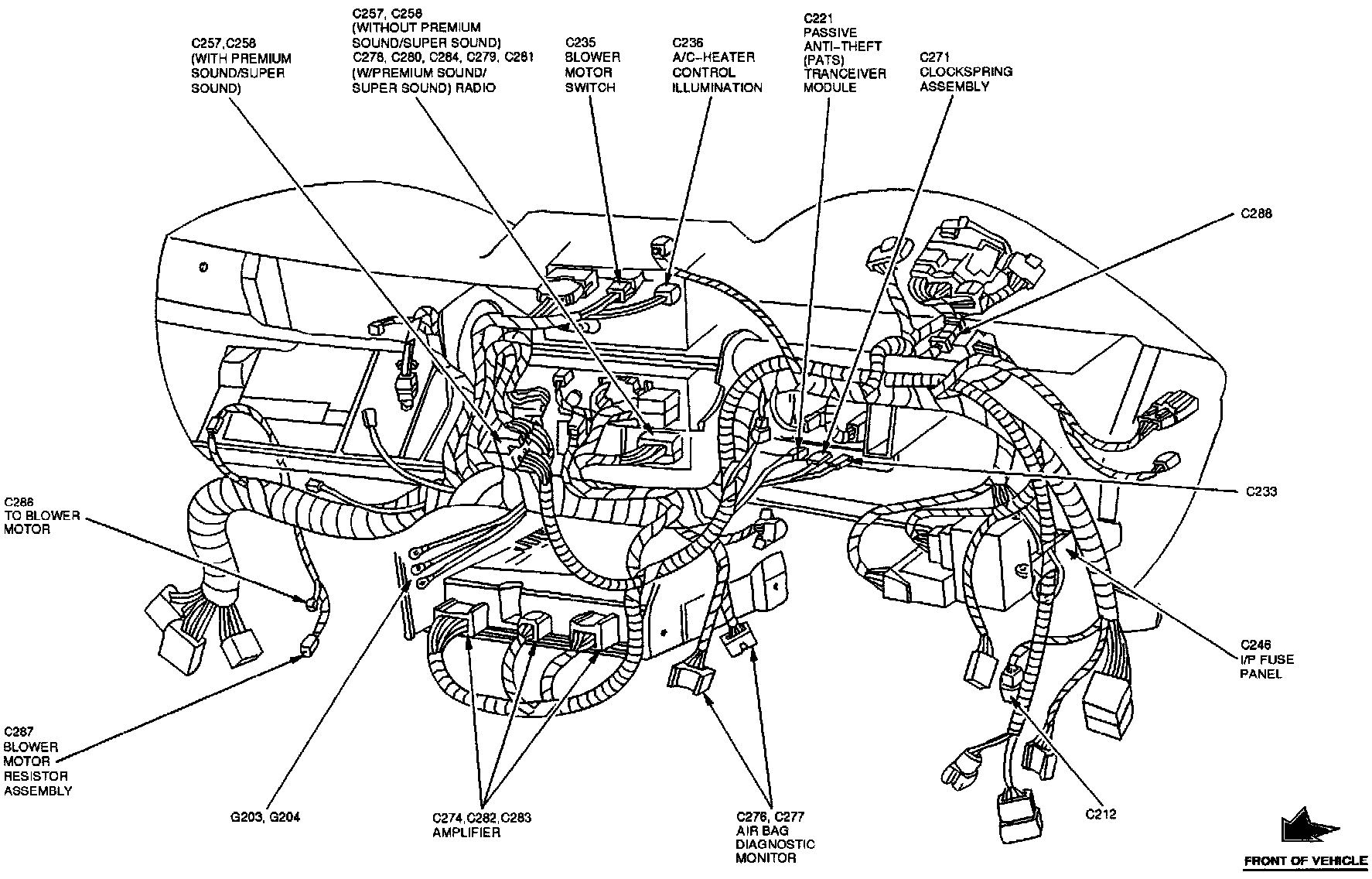 The Air Bag Diagnostic Monitor is located behind lower center of the instrument panel.