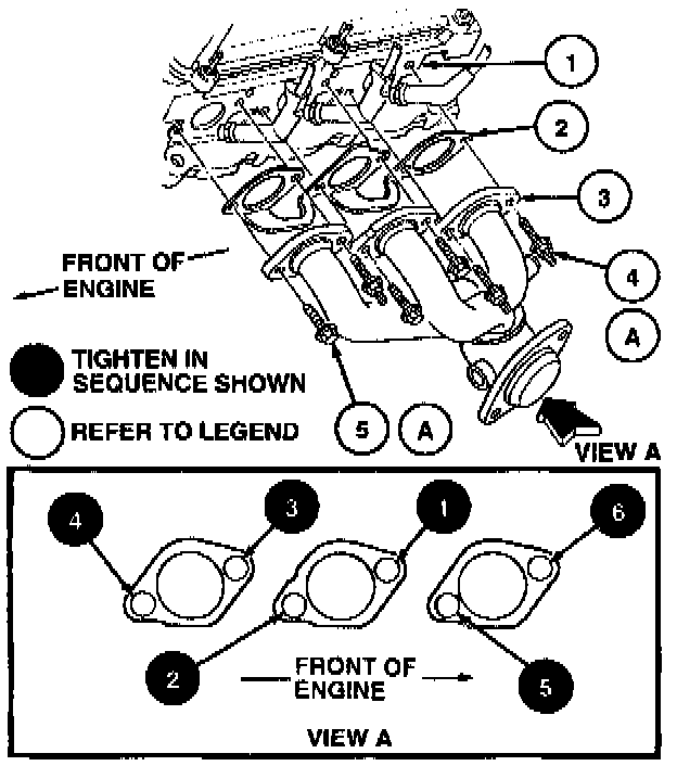 Start new remaining exhaust manifold retaining stud bolts and bolts. Tighten new exhaust manifold retaining bolts to 30-36 Nm (23-26 ft. lbs.) in the sequence shown in the illustration.