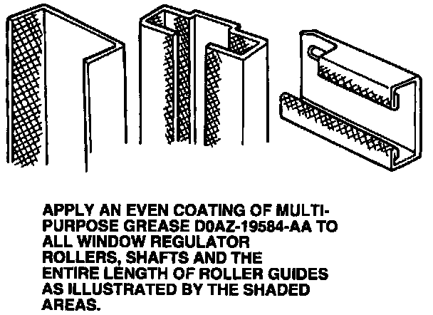 The front door glass hinge side run must be well lubricated to provide ease of operation. The front door glass hinge side run must be lubricated whenever the glass channel or front door window regulator is removed. Lubricate entire surface prior to assembly with Multi-Purpose Grease Spray F5AZ-19G209-AA or equivalent meeting Ford specification ESR-M1C159-A. To lubricate a front door glass hinge side run, apply an even coating of Multi-Purpose Grease DOAZ-19584-AA or equivalent meeting Ford specification ESB-M1C93-A to the window regulator arm roller, shafts and entire length of the roller guides as illustrated by the shaded areas.