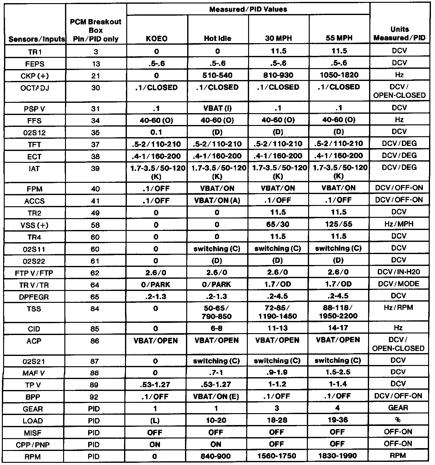 - All generic OBD II readings under no load (PARK or NEUTRAL).