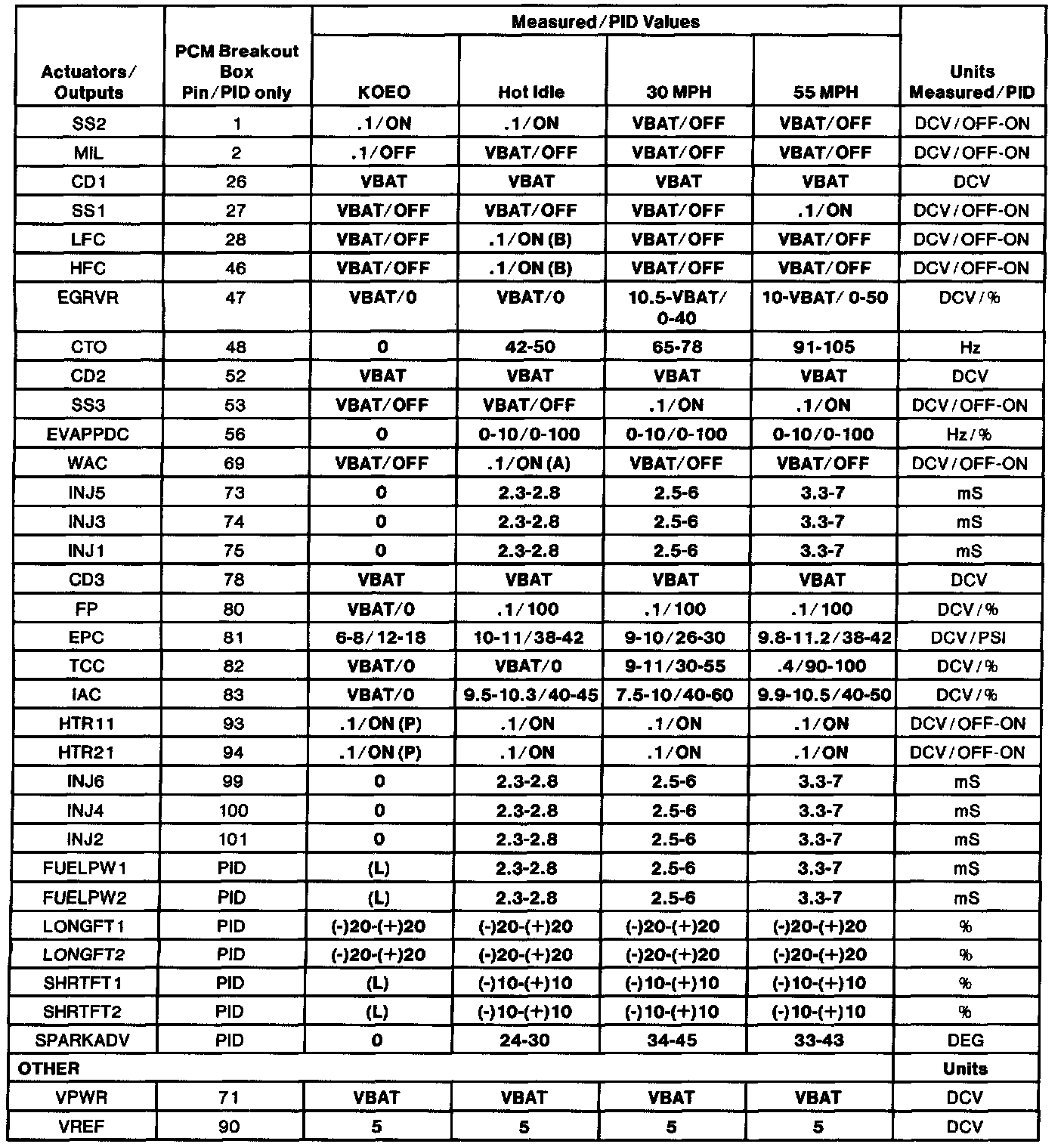 - The Typical Diagnostic Reference Value Charts do not display fault PIDs. These are PIDs which indicate a hard fault with the circuit. They display a value of "YES" or "NO" and are PIDs ending with an "F". These do not include EVAPPF, FF, MAF or VREF.