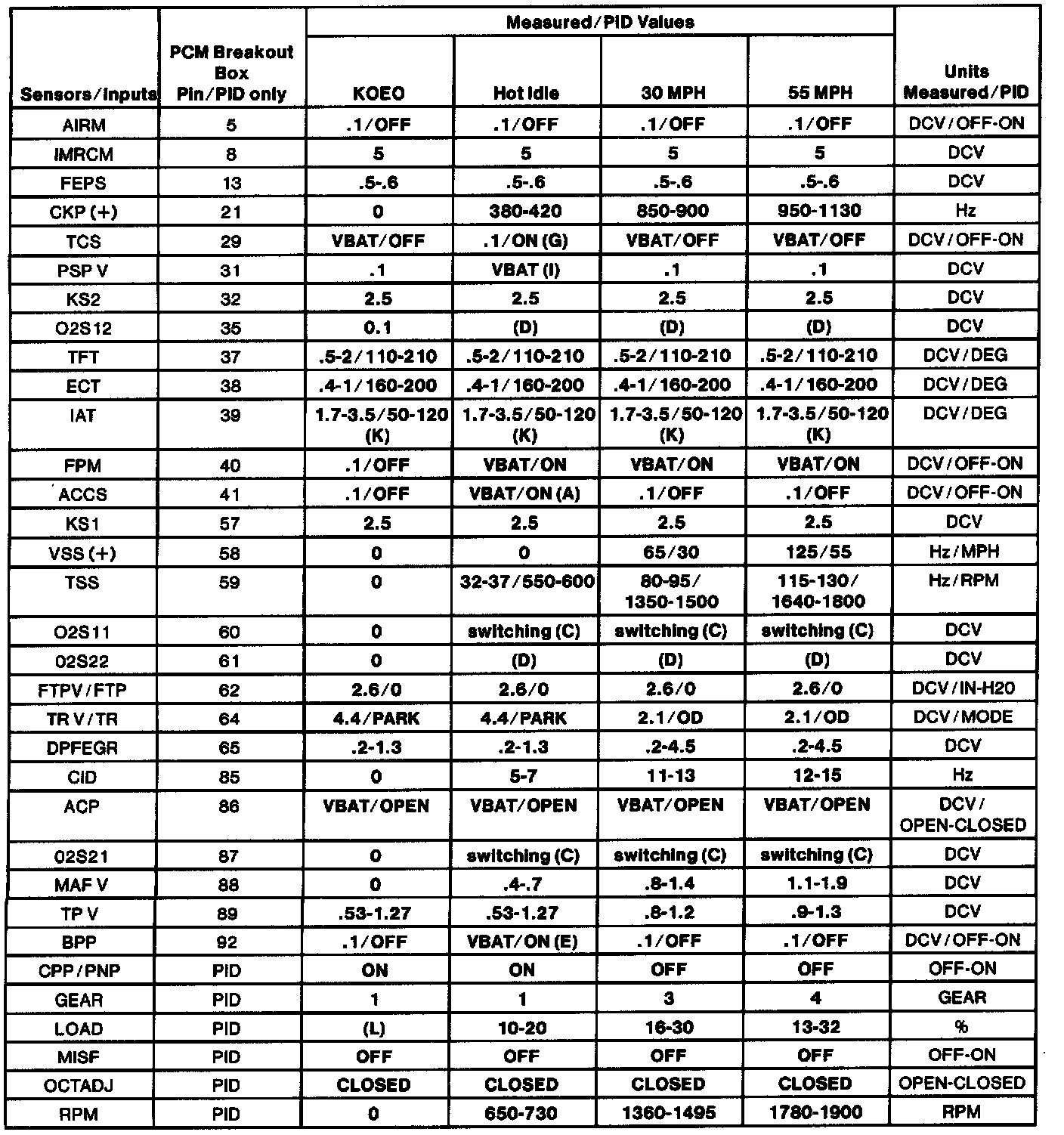 - The Typical Diagnostic Reference Value Charts do not display fault PIDs. These are PIDs which indicate a hard fault with the circuit. They display a value of "YES" or "NO" and are PIDs ending with an "F". These do not include EVAPPF, FF, MAF or VREF.