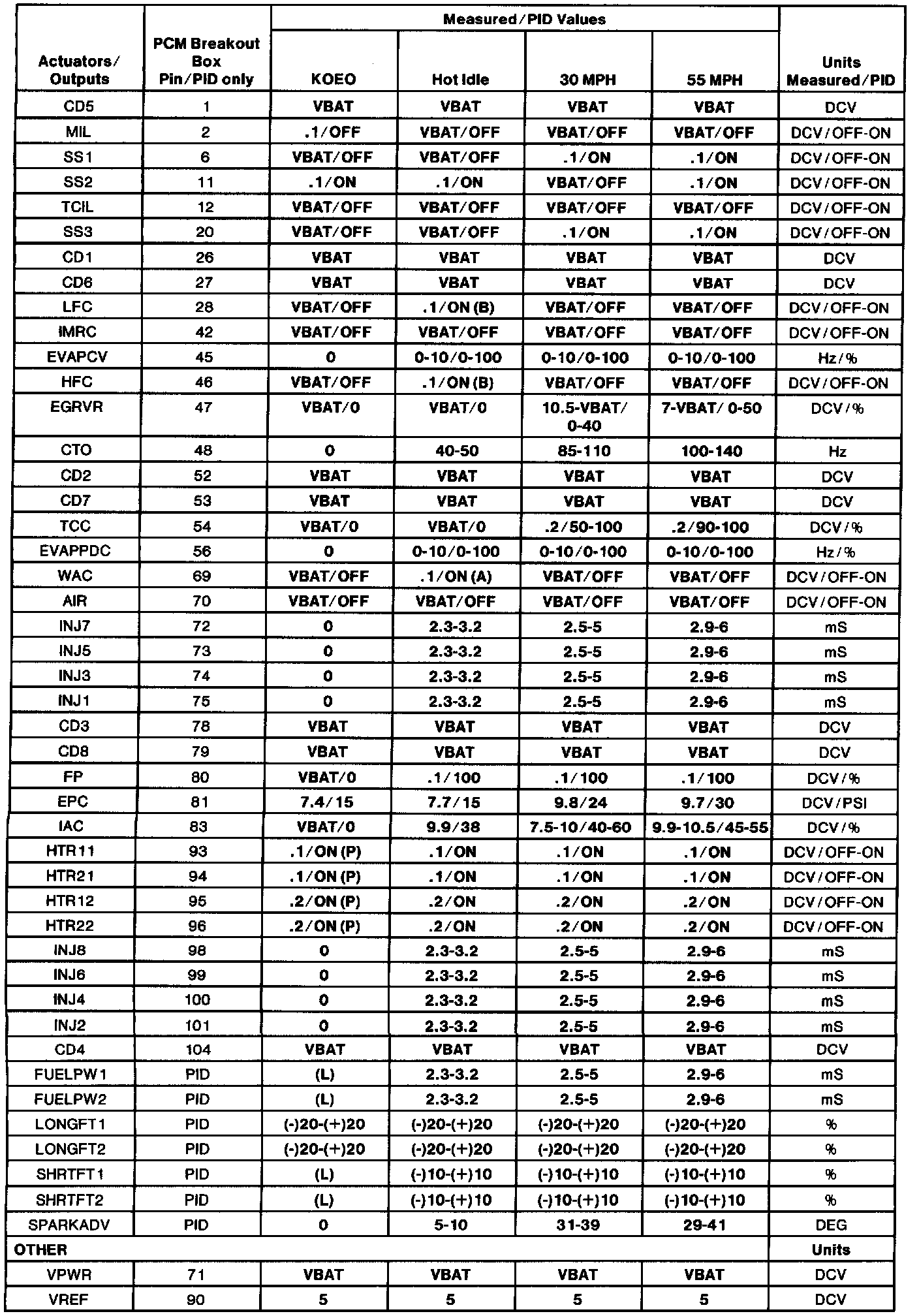 Normal Scan Data Values - Includes Pids