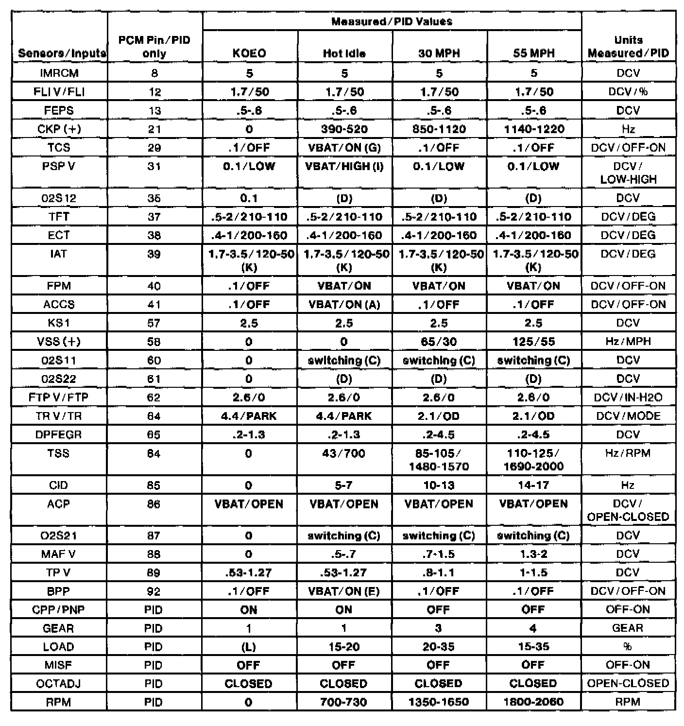 - The Typical Diagnostic Reference Value Charts do not display fault PIDs. These are PIDs which indicate a hard fault with the circuit. They display a value of "YES" or "NO" and are PIDs ending with an "F".