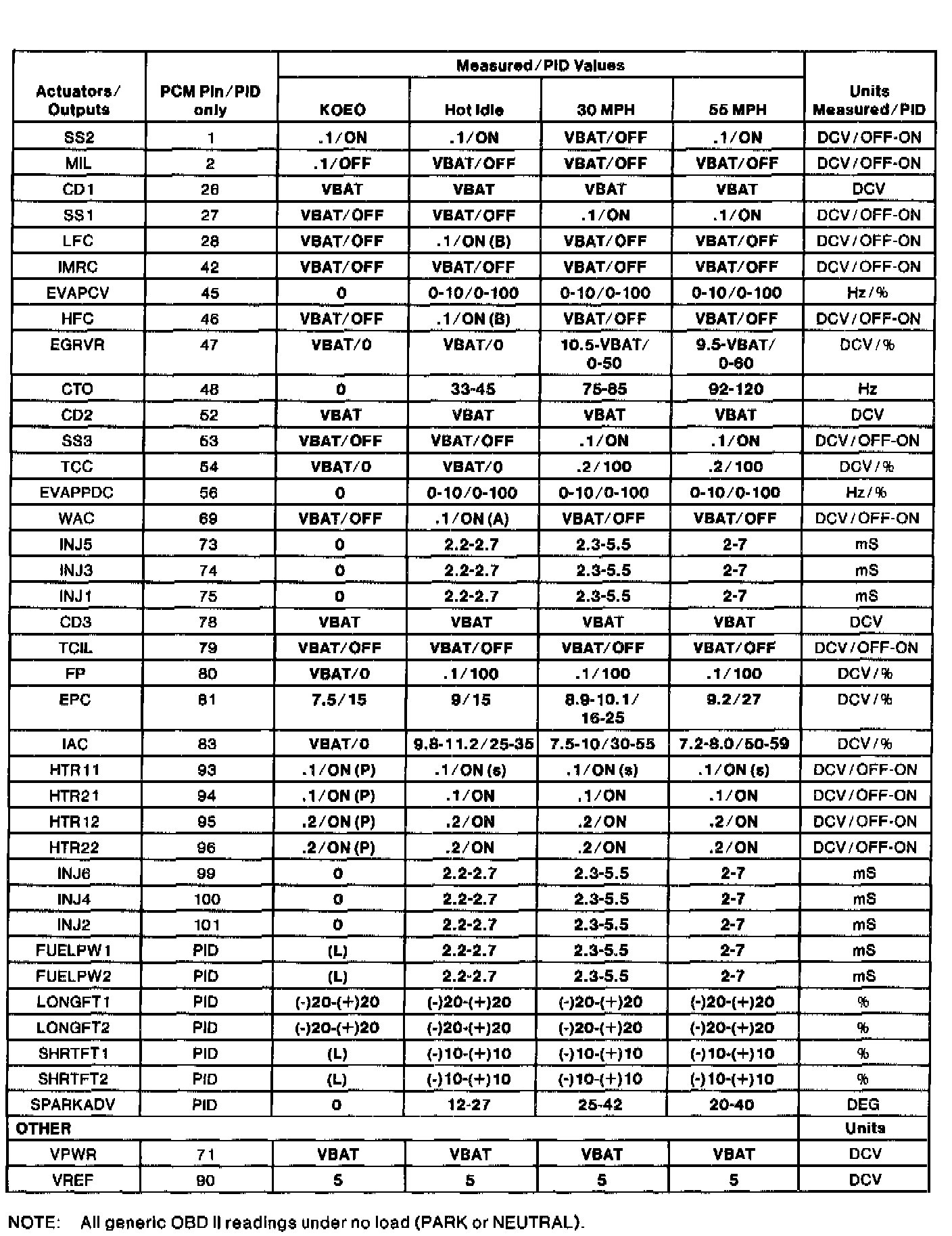 GENERIC OBD II PID VALUES
