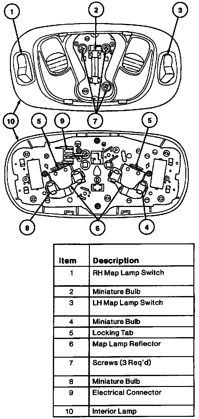 2. On back of interior lamp, use a small, flat blade screwdriver to depress the locking tab that retains the map lamp reflector. Remove reflector.