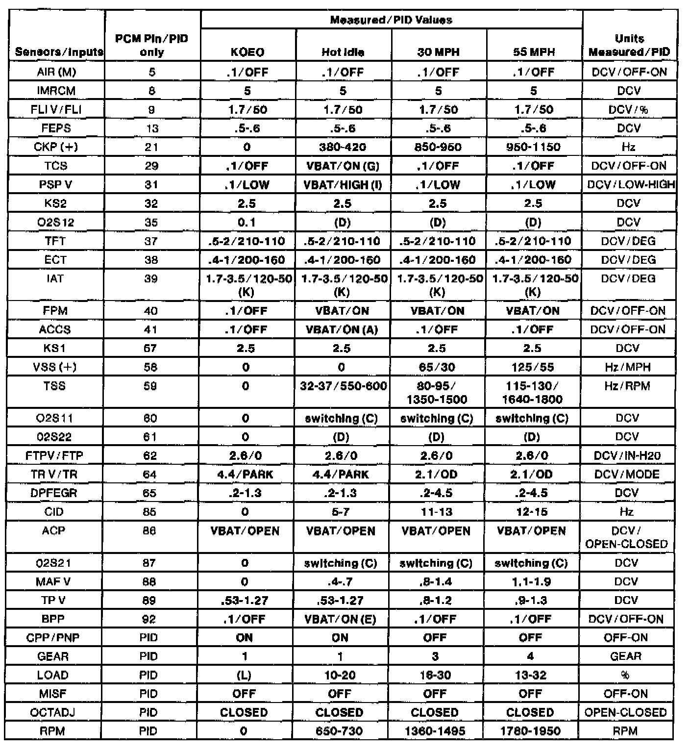 - The Typical Diagnostic Reference Value Charts do not display fault PIDs. These are PIDs which indicate a hard fault with the circuit. They display a value of "YES" or "NO" and are PIDs ending with an "F".