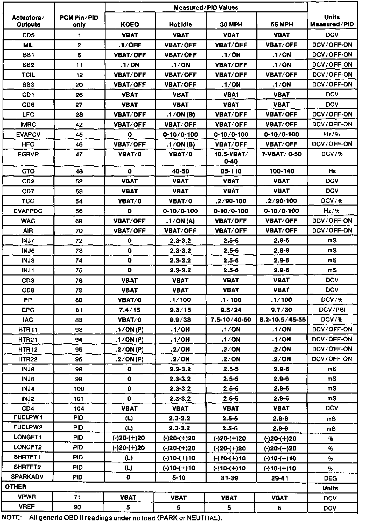 GENERIC OBD II PID VALUES