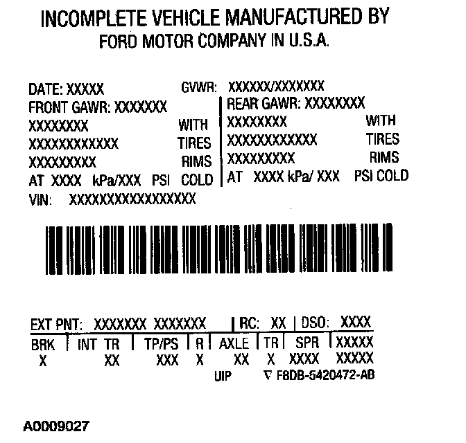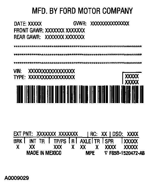 Powertrain calibration information is printed in the lower right corner of the Vehicle Certification Label. Only the base calibration information is printed. Revision levels will not appear, however, they can be found in On Line Automotive Service Information System (OASIS). For the current model year, Ford Motor Company is using three different protocols which describe powertrain base calibration. These protocols are designed to provide worldwide standardization for vehicle calibration. If the electronic calibration strategy has been used since 1998 and carried into the current model year, protocol 1 will be used. Refer to Protocol 1. If the electronic calibration strategy has been used since 1999 and is carried into the current model year, protocol 2 will be used. Refer to Protocol 2. For new electronic calibration strategies for the current model year, use protocol 3. Refer to Protocol 3.