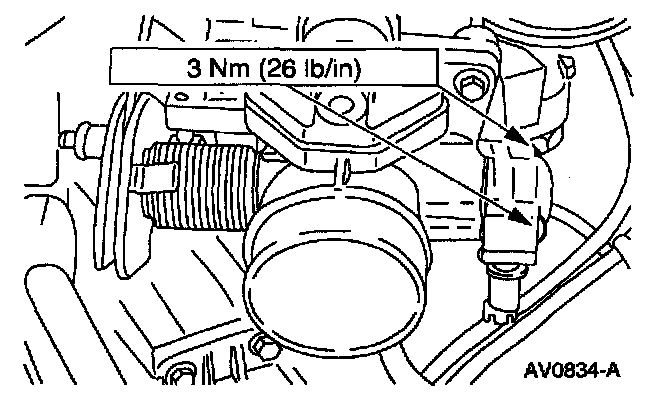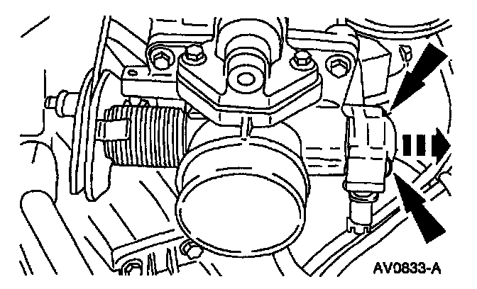 1. CAUTION: Slide the rotary tangs of the TP sensor, rotated one-quarter turn clockwise away from the final installed position, into place over the throttle shaft blade, and then rotate the TP sensor counterclockwise only to the Installed position. Failure to install the TP sensor in this manner may result in excessive idle speeds.
