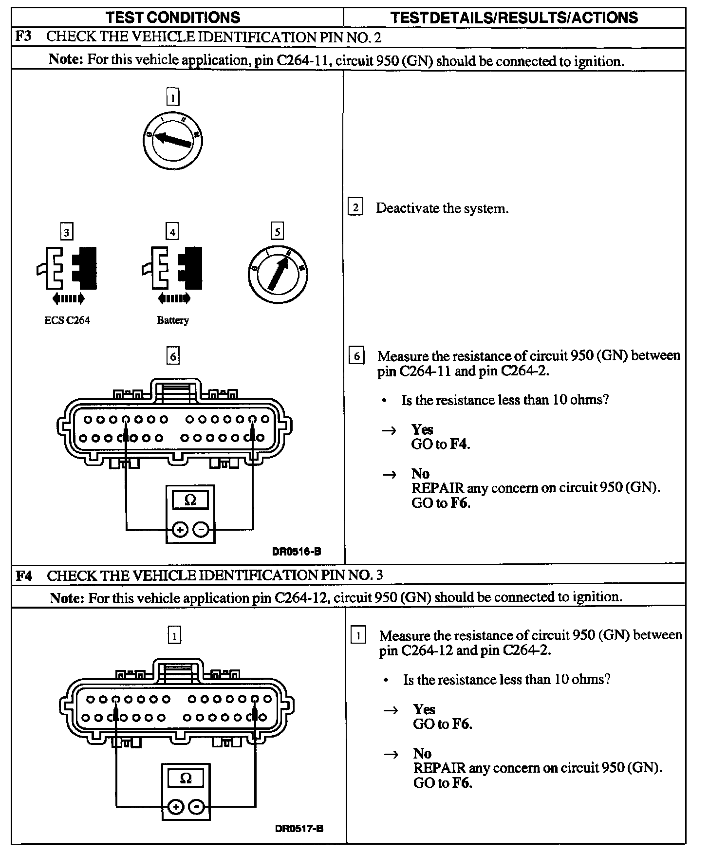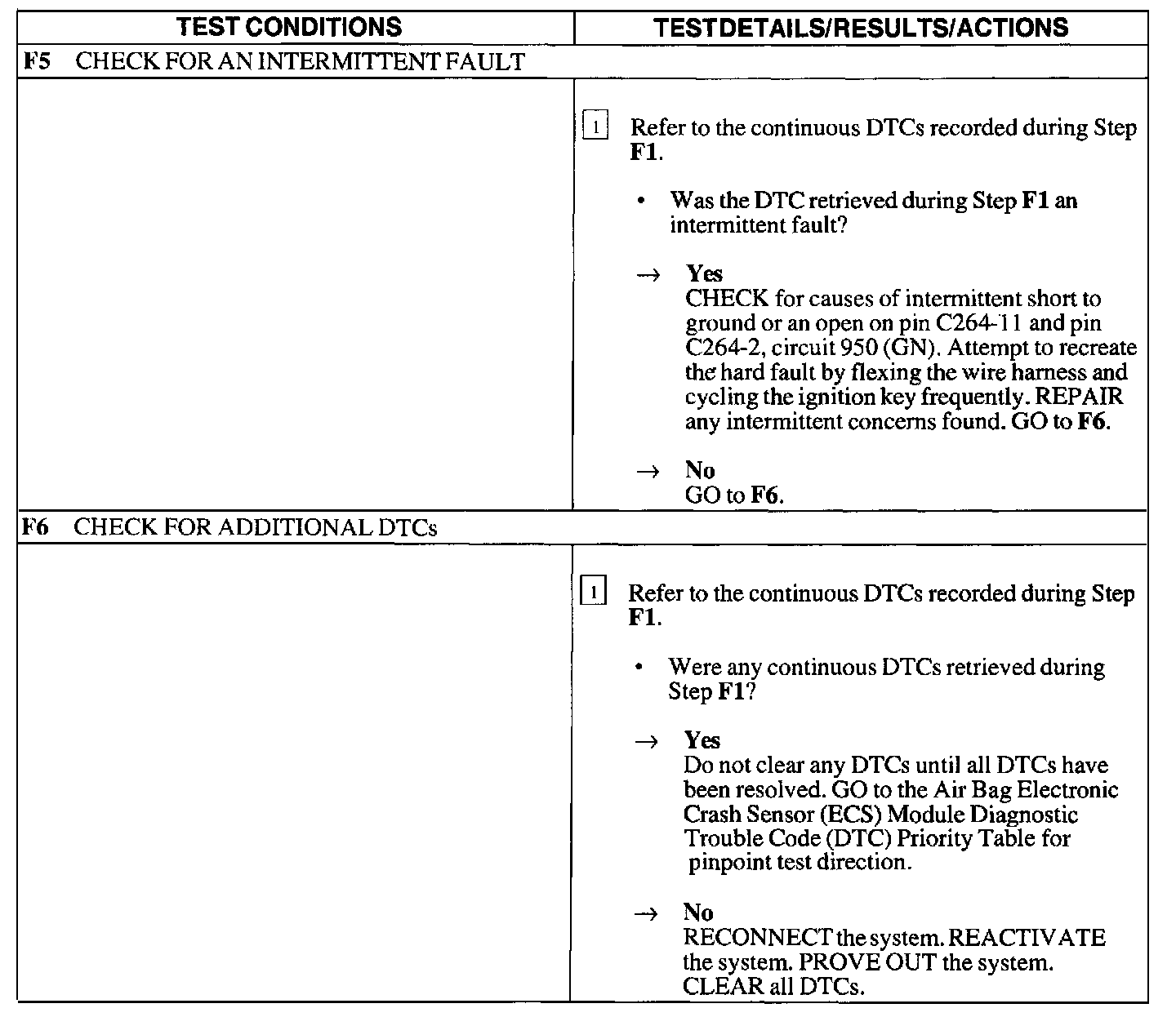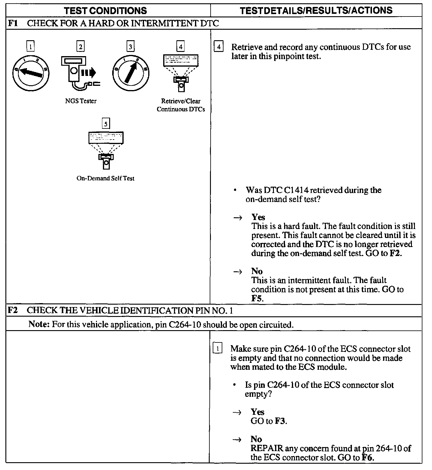 The air bag Electronic Crash Sensor (ECS) module monitors the voltage at pins 10, 11 and 12 to determine if it is installed on the correct vehicle. If the ECS detects an incorrect voltage on any of these pins, it will store a Diagnostic Trouble Code (DTC) C1414 in memory and flash a Lamp Fault Code (LFC) 29 (or higher priority code if one exists) on the air bag indicator.
