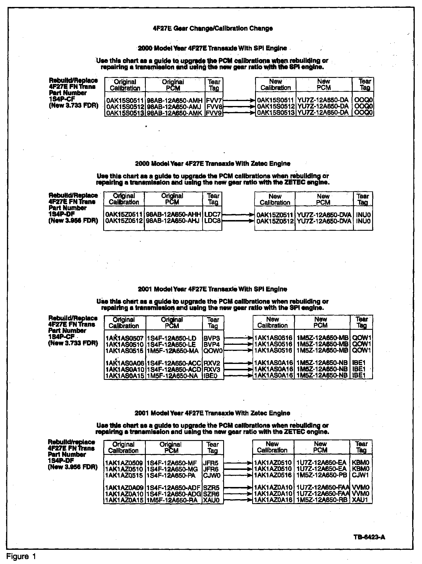 An internal gear change took place to the 4F27E automatic transaxle during the month of December 2000. The number of teeth on the final drive input gear and the transfer shaft input gear were changed, and a new calibration is available to match the new gear ratio. If a change is made to the gear ratio, a calibration change is necessary or the vehicle may exhibit delayed shifts. Refer to the following Service Procedure for details.