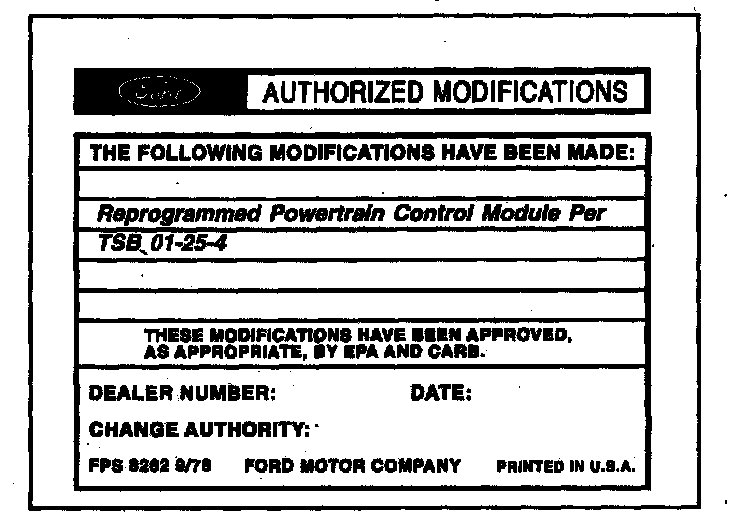 Obtain an Authorized Modifications Decal (FPS 8262 - obtainable through DOES II, 25/pkg) and list the date, dealer number, and summary of modifications performed. Select a prominent place adjacent to the Vehicle Emission Control Information Decal suitable for installing the Authorized Modifications Decal. Clean the area, install the decal, and cover it with a clear plastic decal shield.
