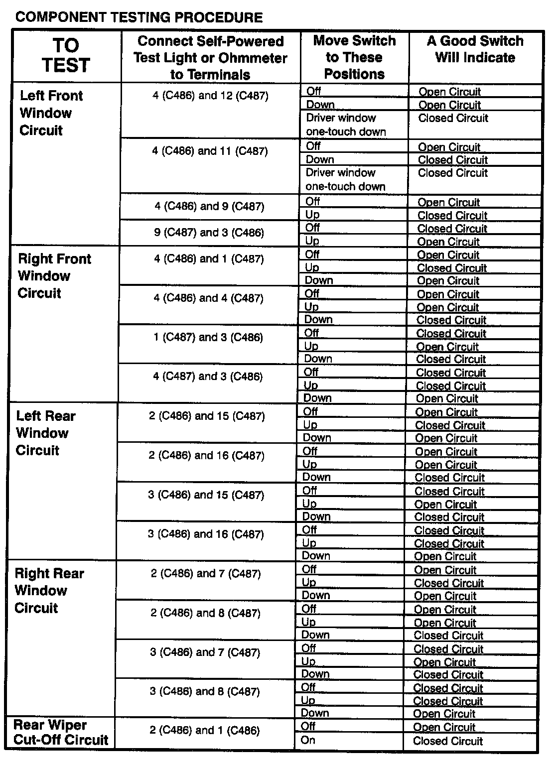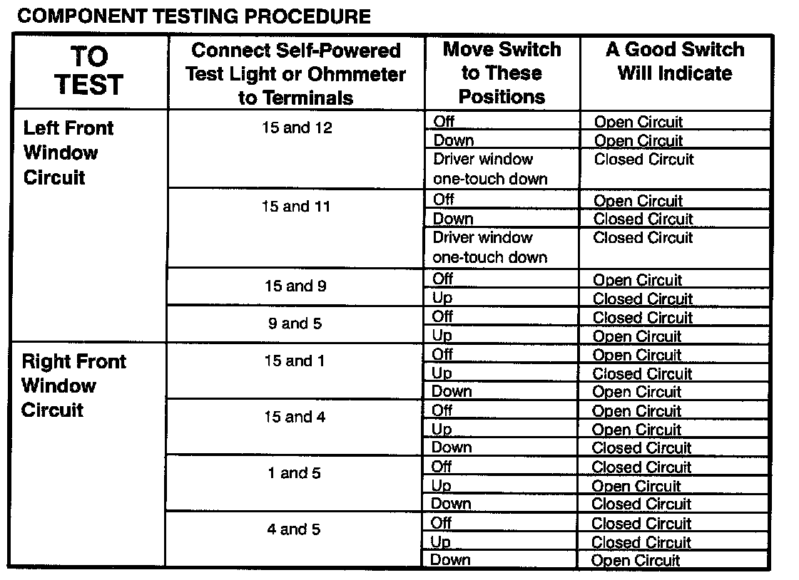 The component connector MUST BE REMOVED before testing. To test a single circuit within the component, select that circuit under the column TO TEST If you wish to test the complete component, perform all tests.