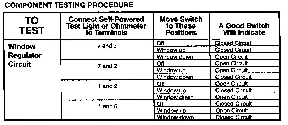 The component connector MUST BE REMOVED before testing. To test a single circuit within the component, select that circuit under the column TO TEST If you wish to test the complete component, perform all tests.