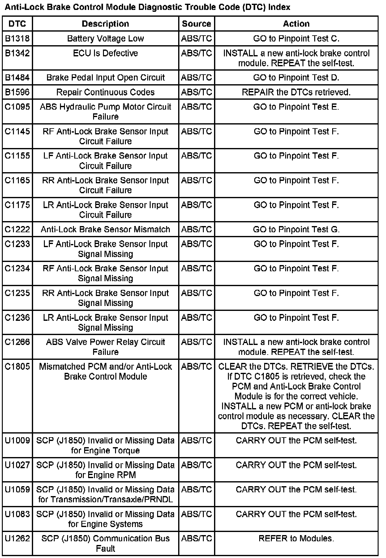 Anti-Lock Brake Control Module Diagnostic Trouble Code (DTC) Index