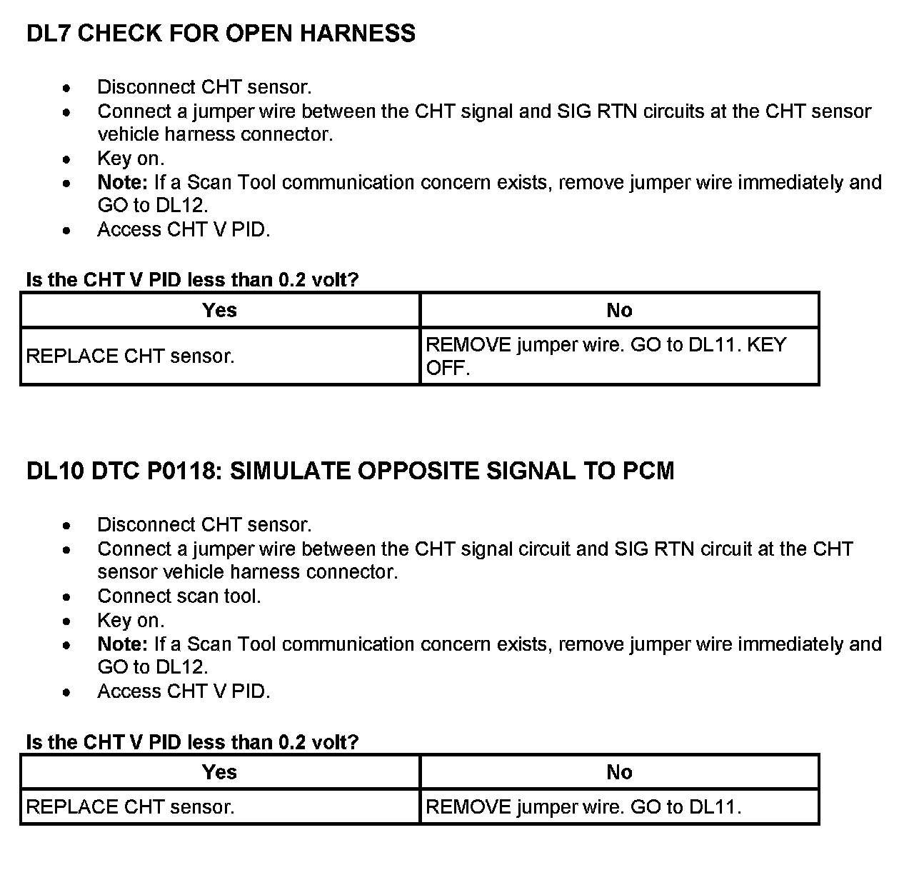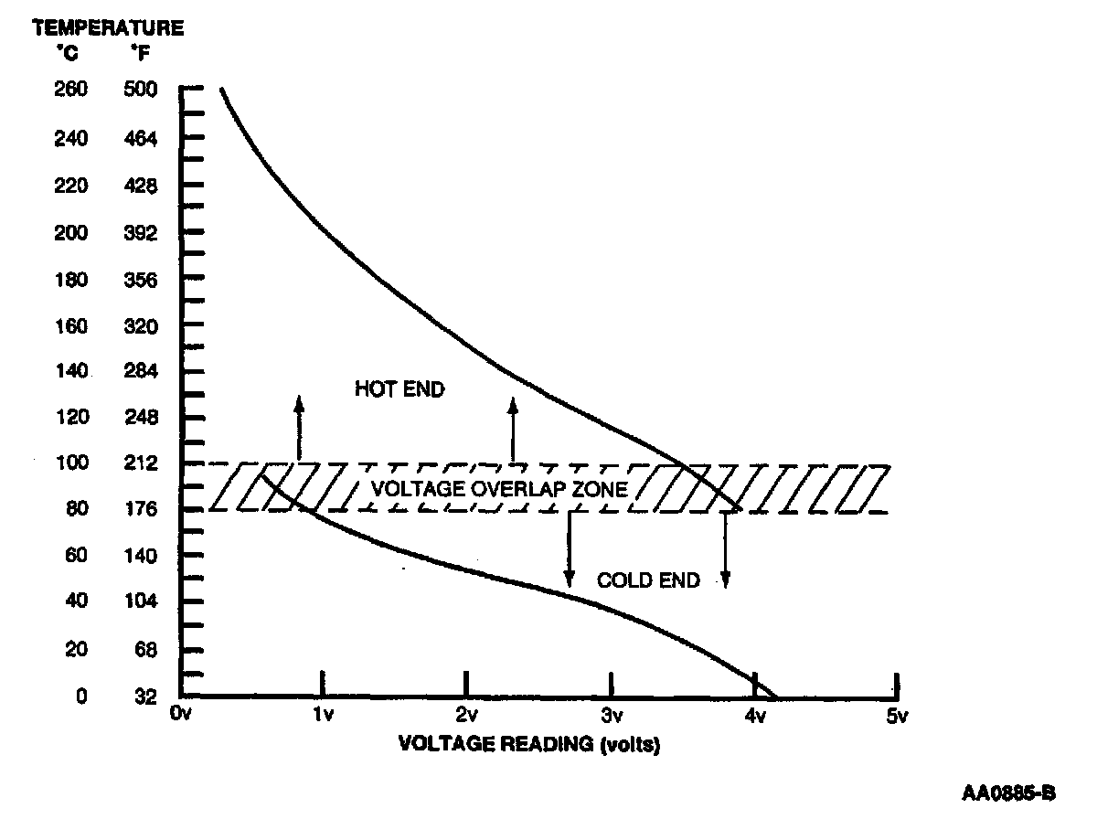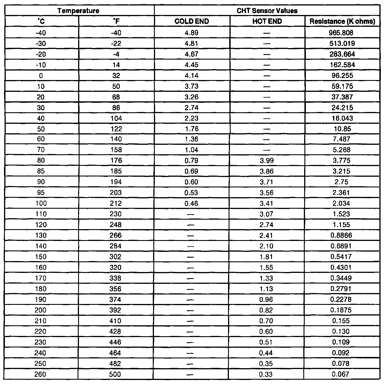 On applications that do not use a ECT sensor, the CHT sensor is used to determine the engine coolant temperature in place of the ECT sensor. In this case the PCM may store both CHT and ECT Diagnostic Trouble Codes (DTCs). To cover the entire temperature range of both the CHT and Engine Coolant Temperature (ECT) sensors, the PCM has a dual switching resistor circuit on the CHT input. A graph showing the temperature switching from the COLD END line to the HOT END line with increasing temperature and back with decreasing temperature is included. Note the temperature to voltage overlap zone. Within this zone it is possible to have either a COLD END or HOT END voltage at the same temperature. For example, at 90°C (194°F) the voltage could read either 0.60 volt or 3.71 volts. Refer to the table for the temperature to voltage expected values.