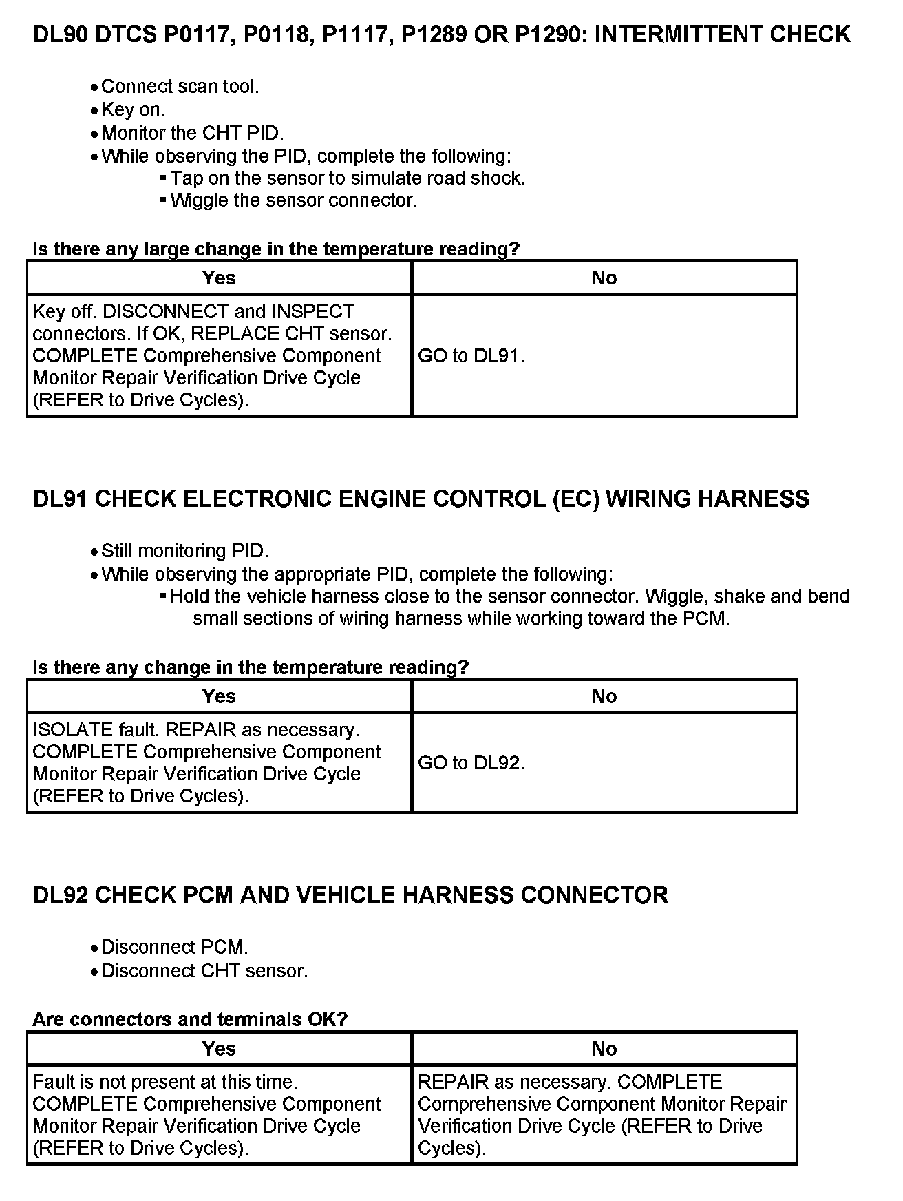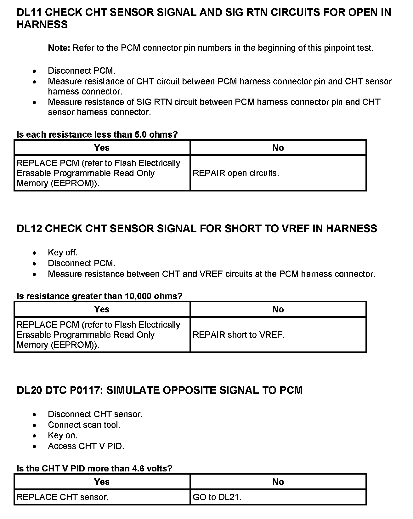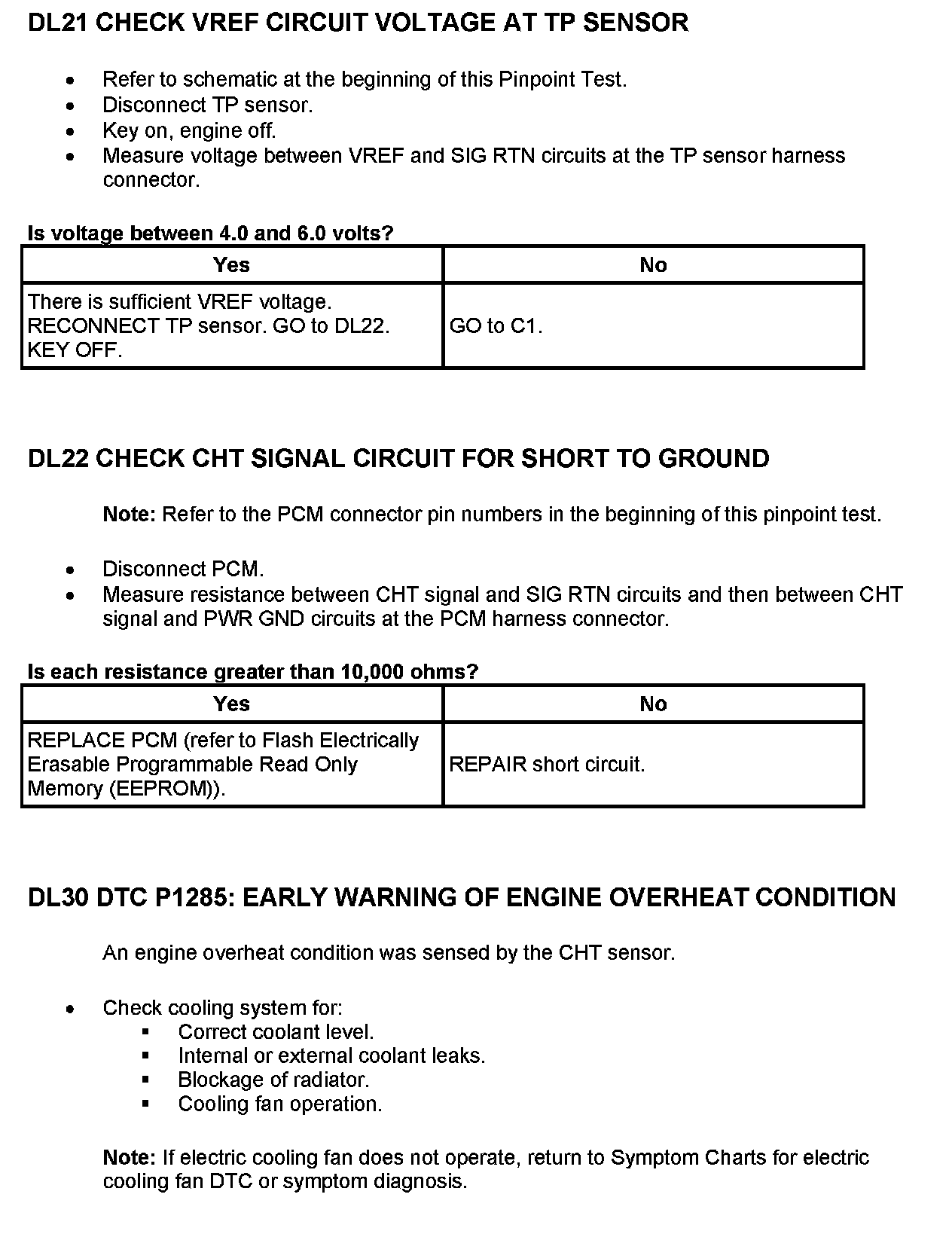 On applications that do not use a ECT sensor, the CHT sensor is used to determine the engine coolant temperature in place of the ECT sensor. In this case the PCM may store both CHT and ECT Diagnostic Trouble Codes (DTCs). To cover the entire temperature range of both the CHT and Engine Coolant Temperature (ECT) sensors, the PCM has a dual switching resistor circuit on the CHT input. A graph showing the temperature switching from the COLD END line to the HOT END line with increasing temperature and back with decreasing temperature is included. Note the temperature to voltage overlap zone. Within this zone it is possible to have either a COLD END or HOT END voltage at the same temperature. For example, at 90°C (194°F) the voltage could read either 0.60 volt or 3.71 volts. Refer to the table for the temperature to voltage expected values.