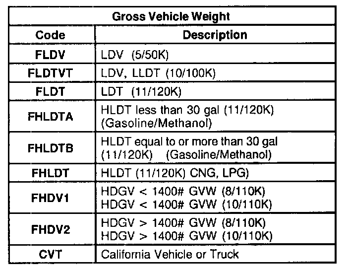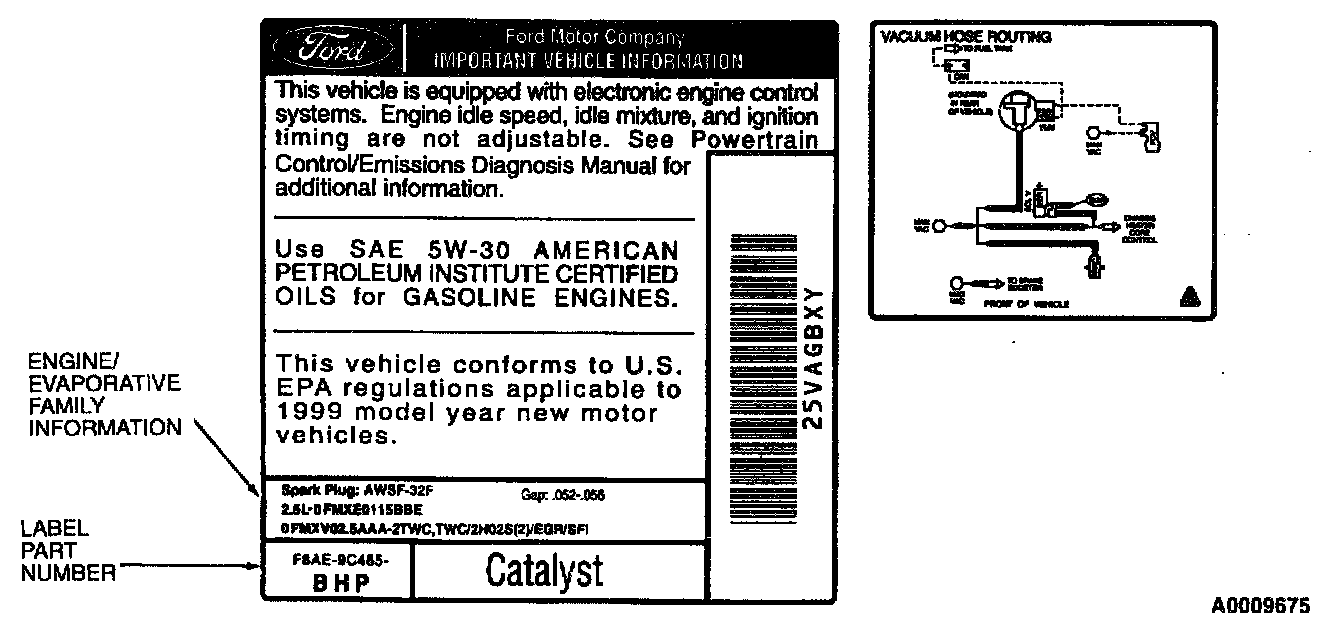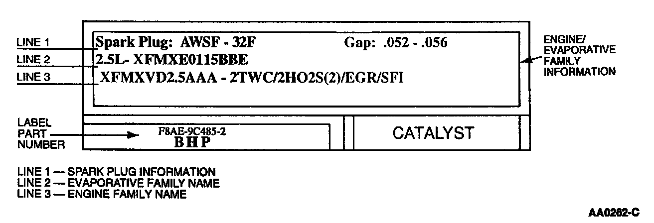 Both the engine family name and the evaporative family names are listed in the box on the emission decal as indicated, in the area marked as engine/evaporative family information. The first line is the spark plug information. The second line contains the engine size and the evaporative family name (12 characters). The third line contains the engine family name (12 characters) and other vehicle specific information.