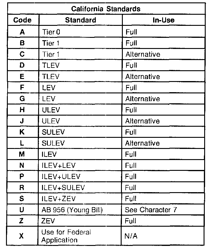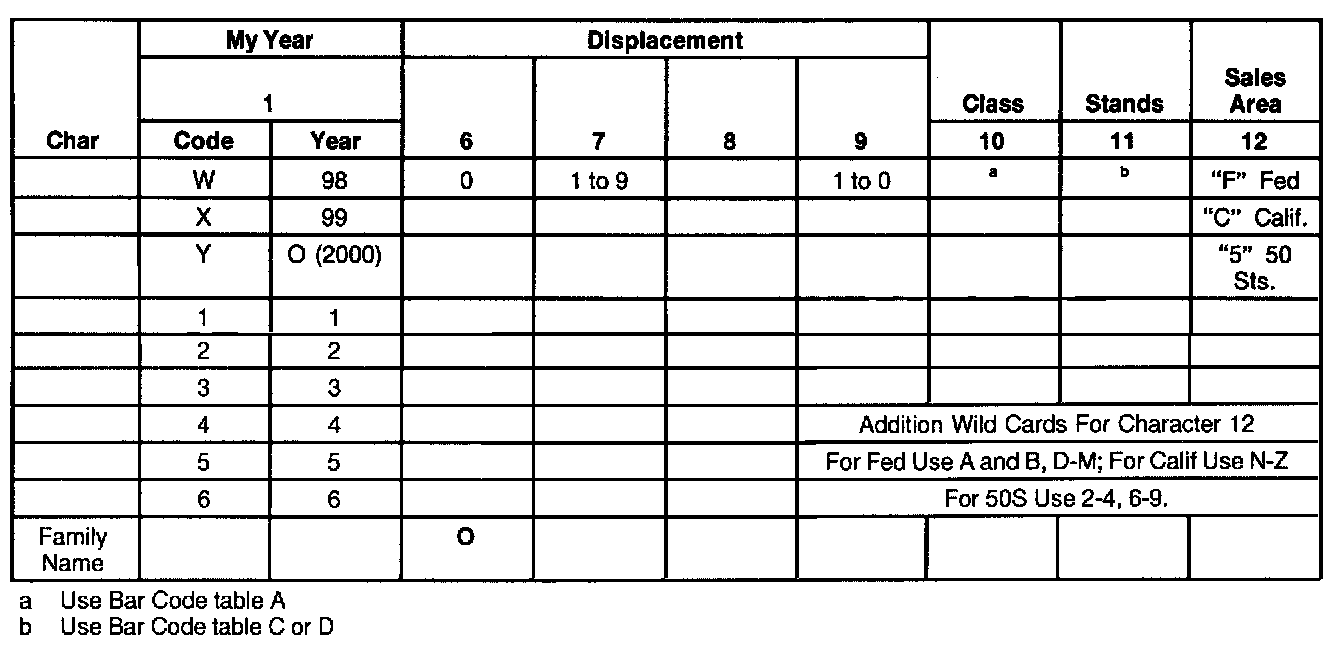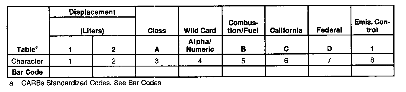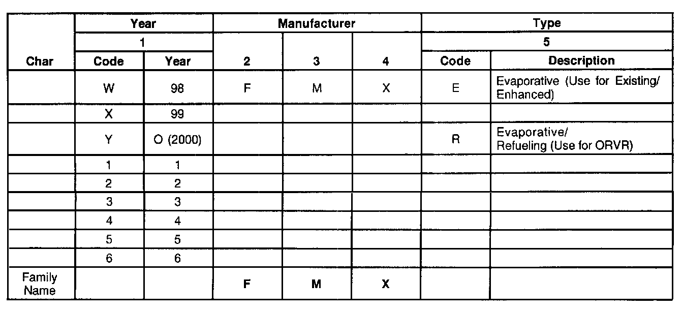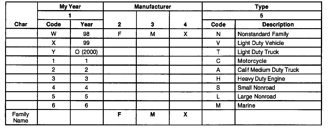 Manufacturers must use a standardized system for identifying their individual engine families. The system described below was developed by the Environmental Protection Agency (EPA) in 1991 to meet new regulatory requirements for 1994 and later model years.