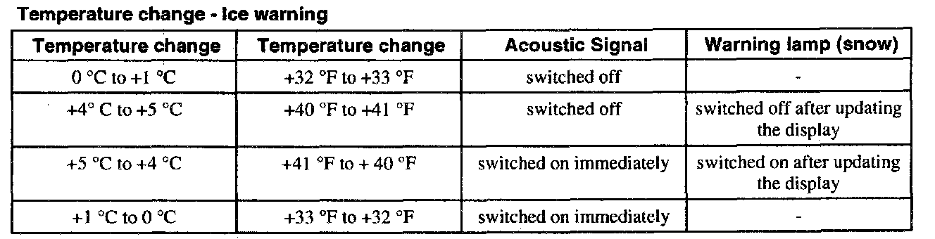 The ambient temperature gauge supplies the trip computer module with the current ambient temperature. At certain temperature changes, the trip computer module outputs an ice warning to warn the driver of black ice on the road: