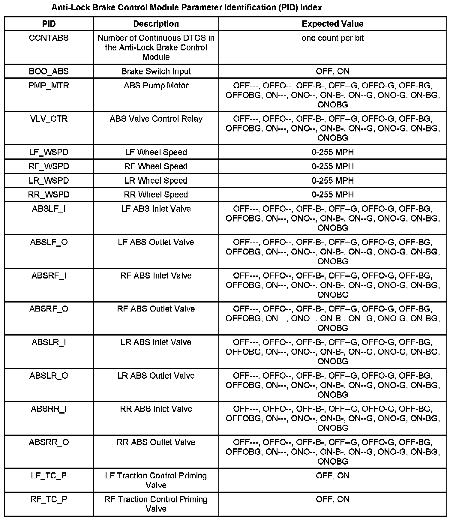 Anti-Lock Brake Control Module Parameter Identification (PID) Index