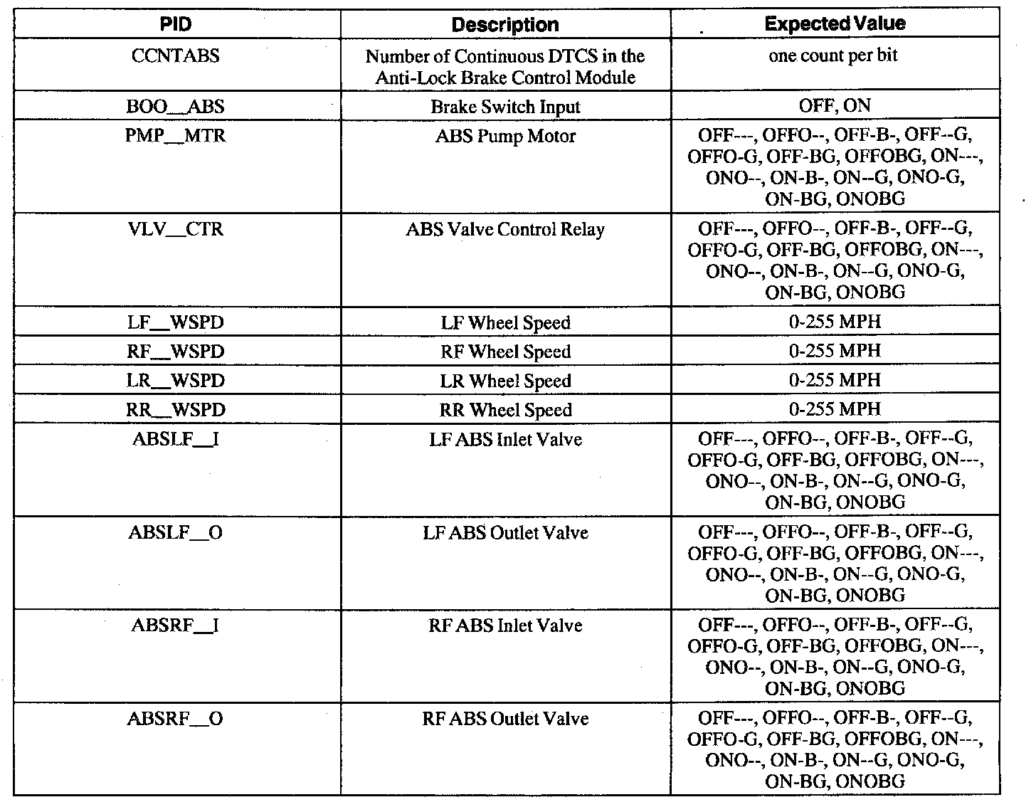 ABS Control Module Parameter Identification (PID) Index