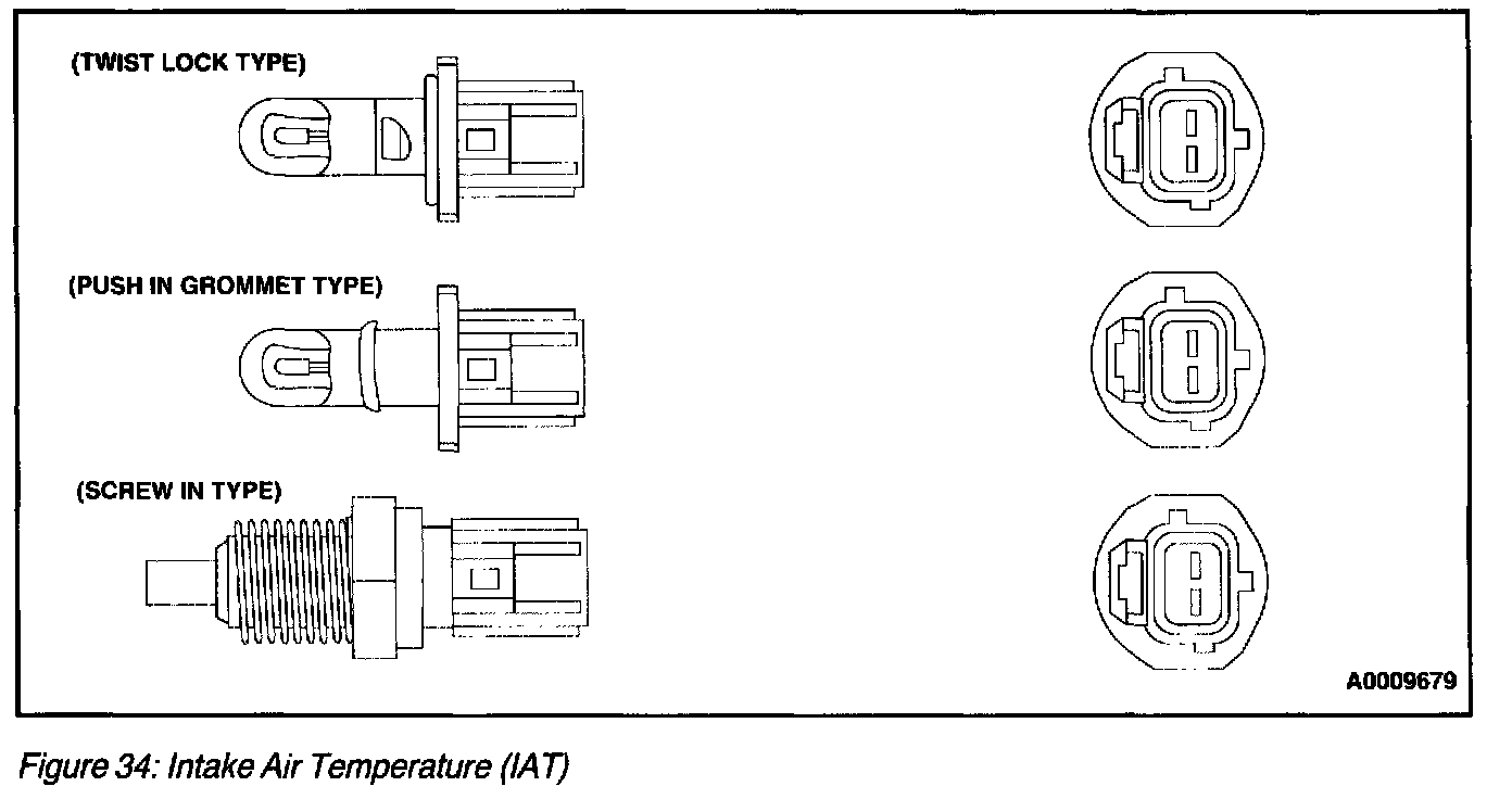 The Intake Air Temperature (IAT) sensors (Figure 34) and integrated Mass Air Flow (MAF) type (Figure 37), are thermistor devices in which resistance changes with temperature. The electrical resistance of a thermistor decreases as the temperature increases, and increases as the temperature decreases. The varying resistance affects the voltage drop across the sensor terminals and provides electrical signals to the PCM corresponding to temperature.