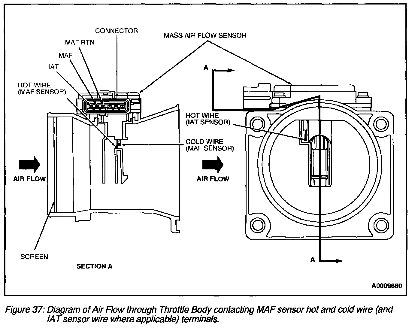 Diagram Of Air Flow Through Throttle Body Contacting MAF Sensor Hot and Cold Wire Terminals: