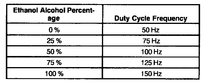 In general, as the percentage of ethanol in the fuel mixture increases, the output frequency of the FF sensor signal increases. The relationship between ethanol alcohol percentage and duty cycle frequency is as follows: