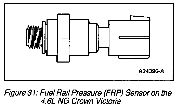 The Fuel Rail Pressure (FRP) sensor (Figure 31) is a diaphragm strain gauge device in which resistance changes with pressure. The electrical resistance of a strain gauge increases as pressure increases, and decreases as pressure decreases. The varying resistance affects the voltage drop across the sensor terminals and provides electrical signals to the PCM corresponding to pressure.
