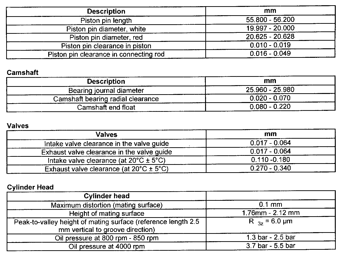 Piston Pin, Camshaft, Valves & Cylinder Head Dimensions: