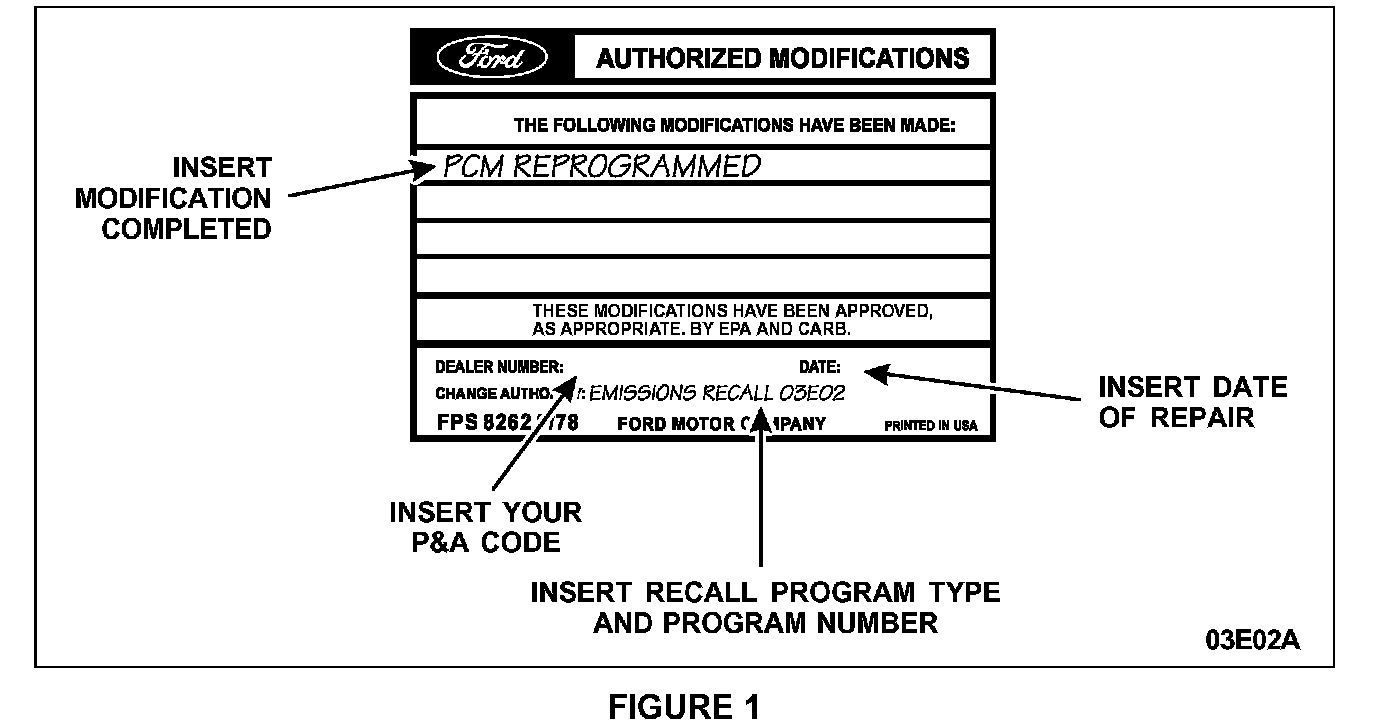 1. Obtain and prepare the Authorized Modifications Label. Write the modification completed, your P&A Code, date of repair and the recall program type and program number. See Figure 1.