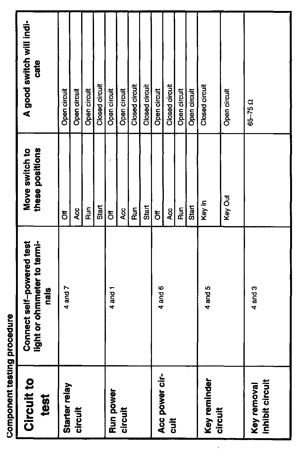 The component connector MUST BE REMOVED before testing. To test a single circuit within the component, select that circuit under the column "Circuit to test". If you wish to test the complete component, perform all tests.