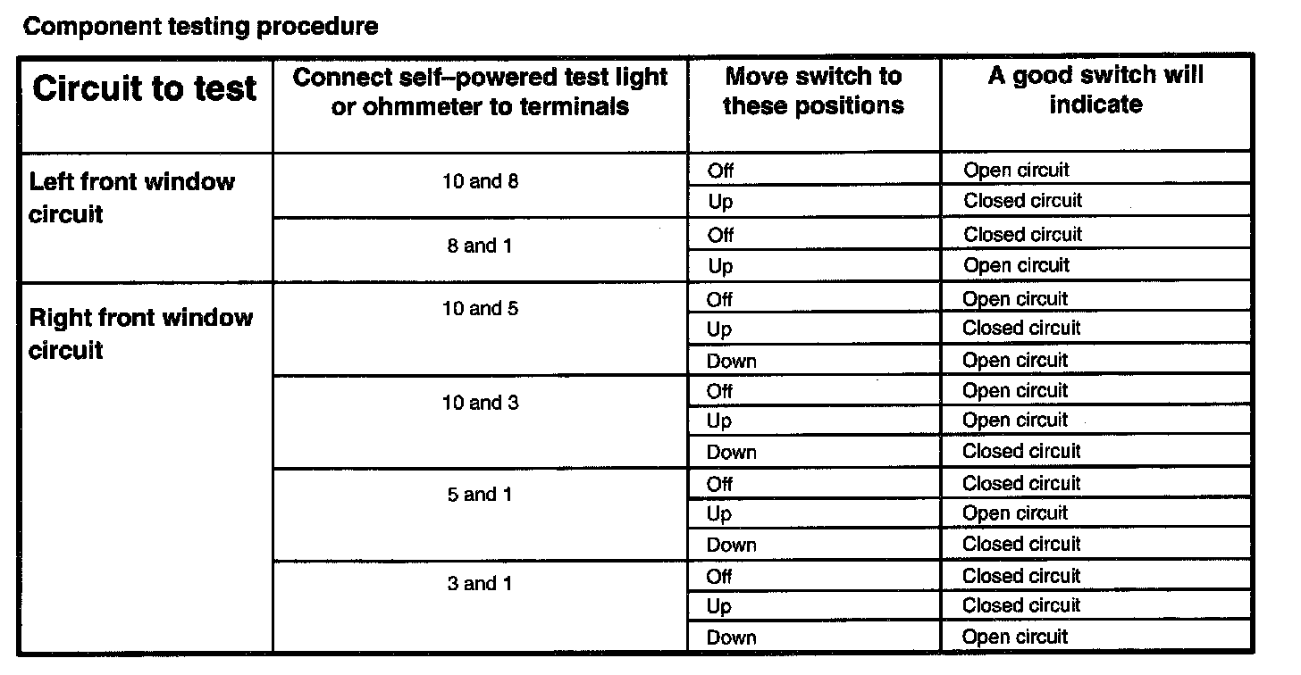 The component connector MUST BE REMOVED before testing. To test a single circuit within the component, select that circuit under the column "Circuit to test". If you wish to test the complete component, perform all tests.
