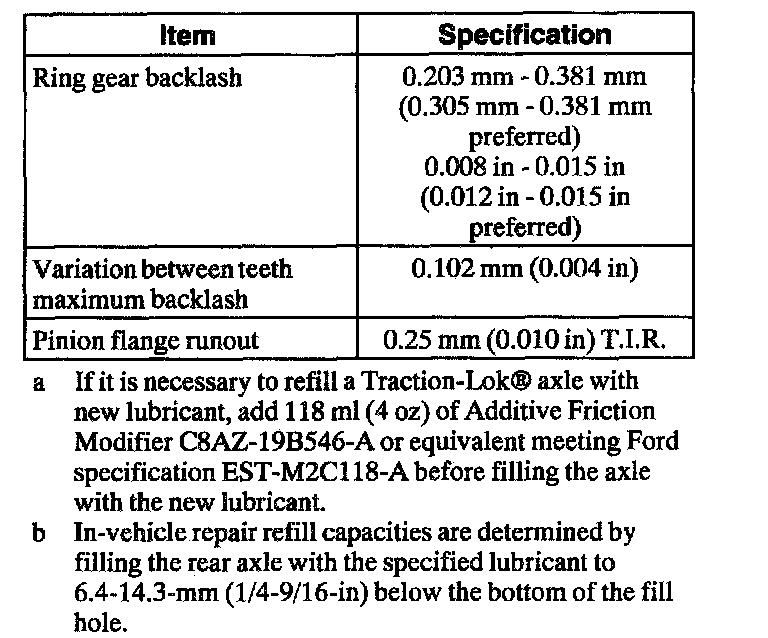 a If it is necessary to refill a Traction-Lok axle with new lubricant, add 118 ml (4 oz) of Additive Friction Modifier C8AZ-1913546-A or equivalent meeting Ford specification EST-M2C118-A before filling the axle with the new lubricant.