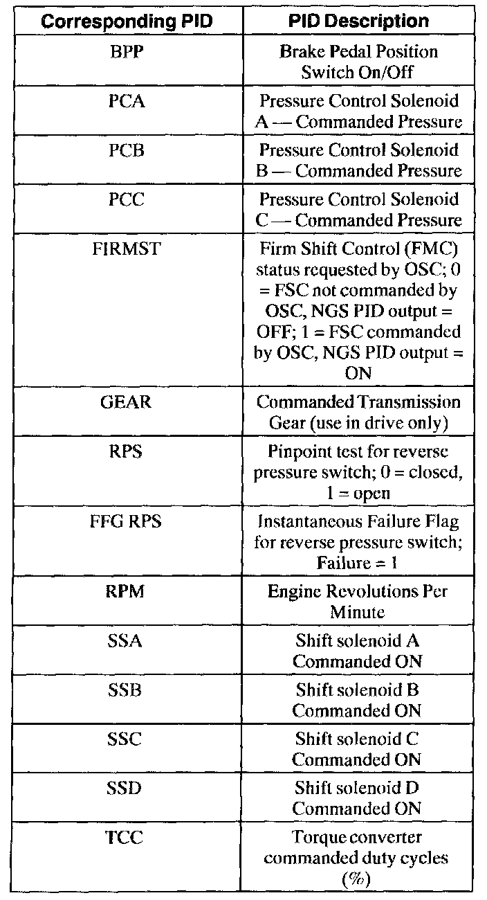 The BENCH MODE is also used to test the functionality of the transmission electronic pressure control. During BENCH MODE, the PCx solenoids can be commanded in increments of 15 psi from zero to 90 psi and 90 to zero psi.