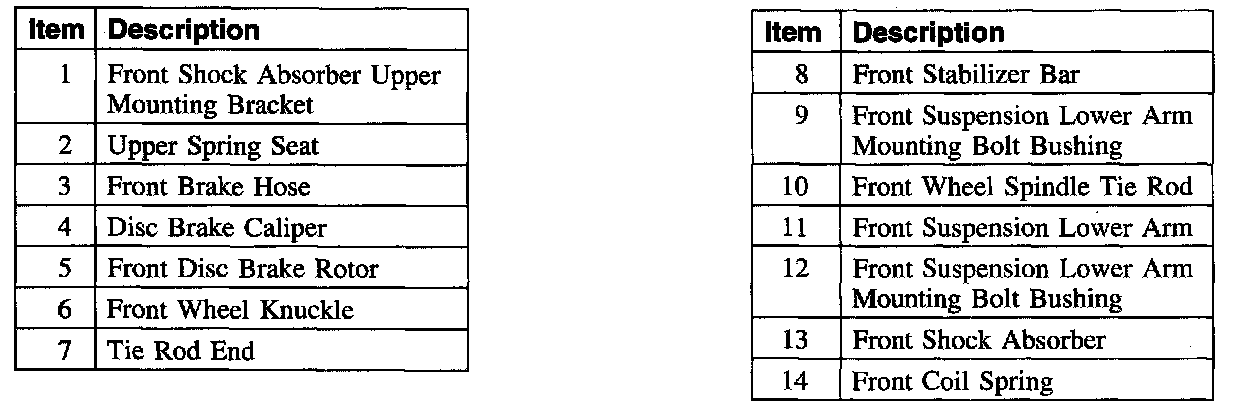 The front strut and spring assemblies can be disassembled to replace any of the individual components. The LH or RH front strut and spring assemblies can be replaced independently.